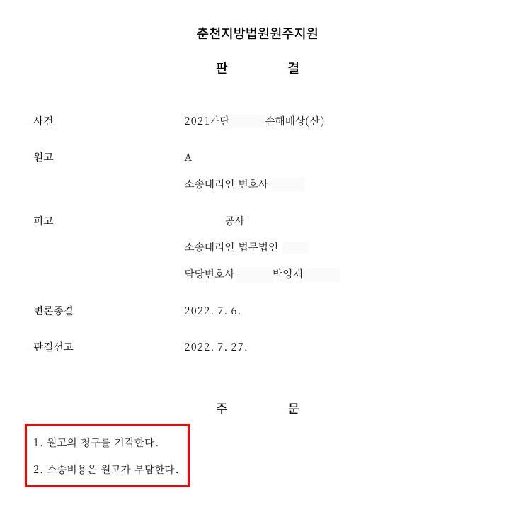 ⑤판결 : 법원은 의뢰인(피고)의 과실이나 안전조치 위반이 인정되지 않아 손해배상책임이 성립하지 않는다고 판단하였고, 설령 그렇지 않더라도 원고의 손해배상청구권은 요양 승인 무렵부터 3년이 경과해 소멸시효가 완성되었다고 보아 원고 청구를 기각하였습니다.