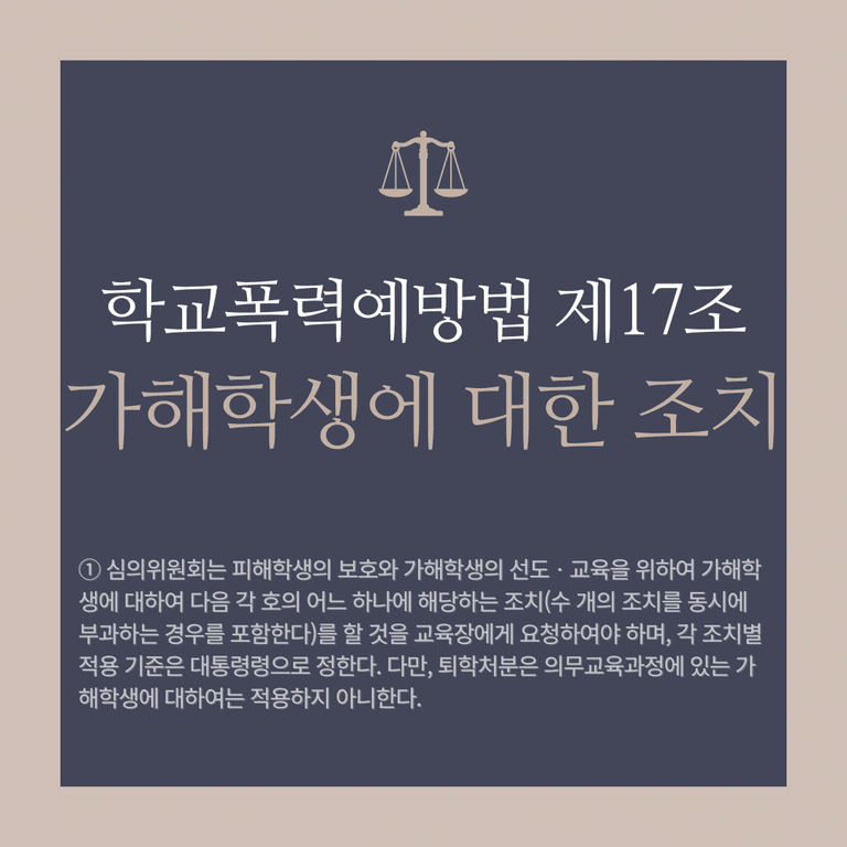 ① 심의위원회는 피해학생의 보호와 가해학생의 선도ㆍ교육을 위하여 가해학생에 대하여 다음 각 호의 어느 하나에 해당하는 조치(수 개의 조치를 동시에 부과하는 경우를 포함한다)를 할 것을 교육장에게 요청하여야 하며, 각 조치별 적용 기준은 대통령령으로 정한다. 다만, 퇴학처분은 의무교육과정에 있는 가해학생에 대하여는 적용하지 아니한다.