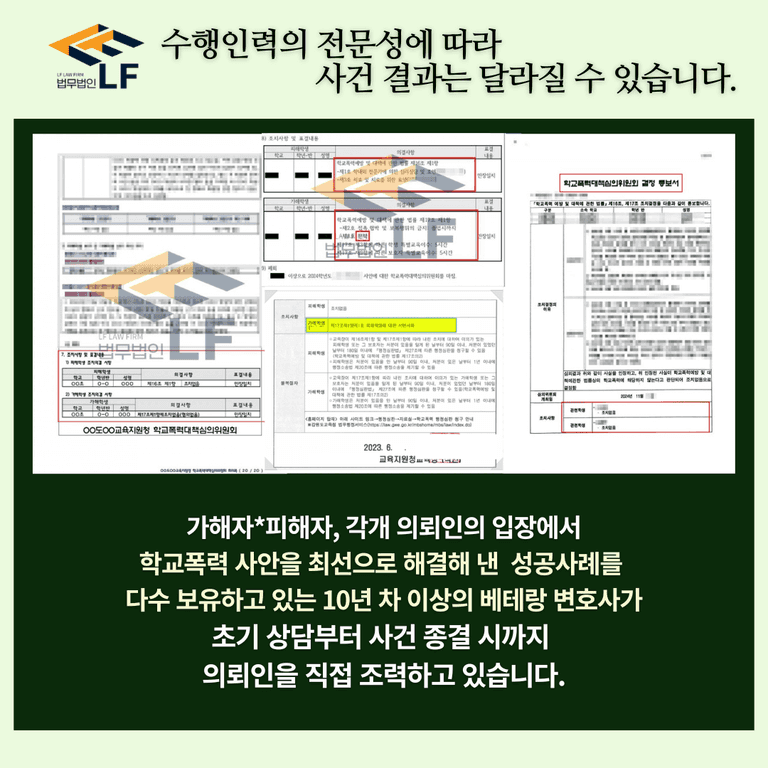 사건 초기에서부터 효과적으로 대응하여 최선의 결과를 구하고자 한다면, 관련 사건 해결 경험이 풍부한 베테랑 학교폭력변호사의 도움을 받는 것이 보다 더 유리할 수 있을 것입니다.
