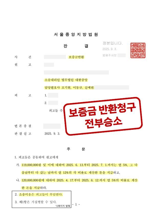 그 결과 재판부는 조기현 변호사의 주장을 모두 인용하는 판결을 내렸습니다. 이에 A씨는 보증금과 이자를 돌려받고, 소송비용 또한 전부 돌려받을 수 있게 되었습니다.