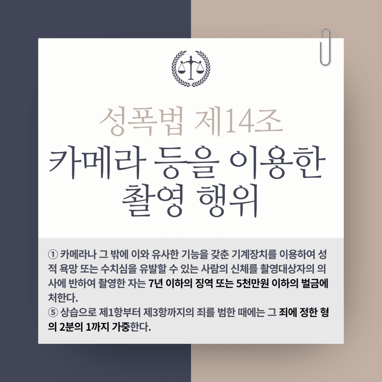 ① 카메라나 그 밖에 이와 유사한 기능을 갖춘 기계장치를 이용하여 성적 욕망 또는 수치심을 유발할 수 있는 사람의 신체를 촬영대상자의 의사에 반하여 촬영한 자는 7년 이하의 징역 또는 5천만원 이하의 벌금에 처한다.
