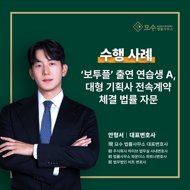 묘수 법률사무소는 최근 인기 오디션 프로그램 ‘보이즈투플래닛(보투플)’ 출연을 통해 대중의 주목을 받은 연습생 A의 대형 연예기획사 전속계약 체결 과정에서 계약서 검토 및 법률 자문을 제공하였습니다.