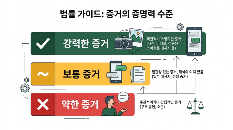 카카오톡 대화와 사진, 영상은 가장 강력한 증거로 인정됩니다. 모텔 결제 내역과 탐정 보고서도 높은 효력을 갖습니다. 통화 녹음과 공동 결제 내역은 중간 정도의 효력을 가지며, 제3자 증언이나 위치정보는 상대적으로 약한 증거에 해당합니다.