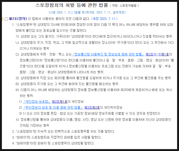"스토킹범죄"를 저지르면 처벌을 받는데(제18조), 여기서의 "스토킹범죄"는 지속적 또는 반복적으로 "스토킹행위"를 하는 것을 말하고(제2조 제2호), 그럼 또 "스토킹행위"가 뭐냐하면, 상대방의 의사에 반하여 정당한 이유 없이 아래 가. ~ 사.의 행위를 하여 불안감 또는 공포심을 일으키는 것을 말합니다(제2조 제1호). 가. ~ 사. 의 행위도 어려운 용어는 빼고 정리를 해볼게요.