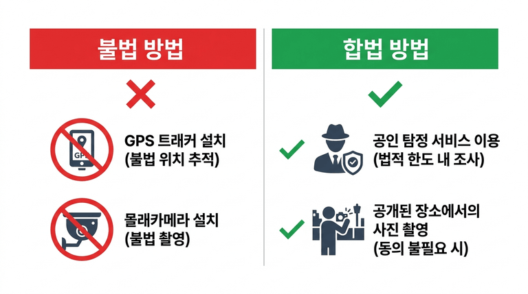 배우자와 외도 상대가 공개된 장소에서 만나는 모습을 촬영하는 것은 합법이며, 다만 화장실이나 모텔 객실 내부와 같은 사적 공간을 촬영하는 것은 불법이므로 모텔 출입 장면이나 주차장에서의 모습 정도만 촬영해야 합니다.