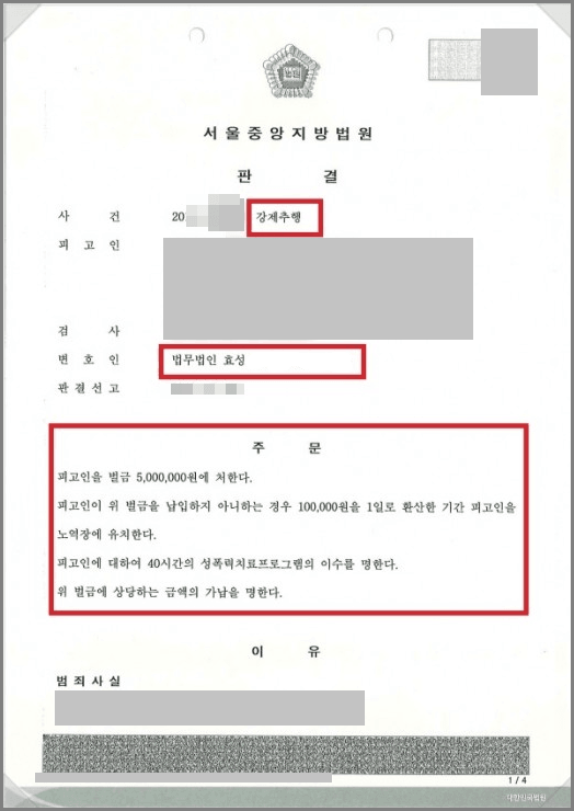 의뢰인이 효성의 조력으로 '벌금형' 을 선고받아 구속을 면한 독보적인 성공 사례입니다.