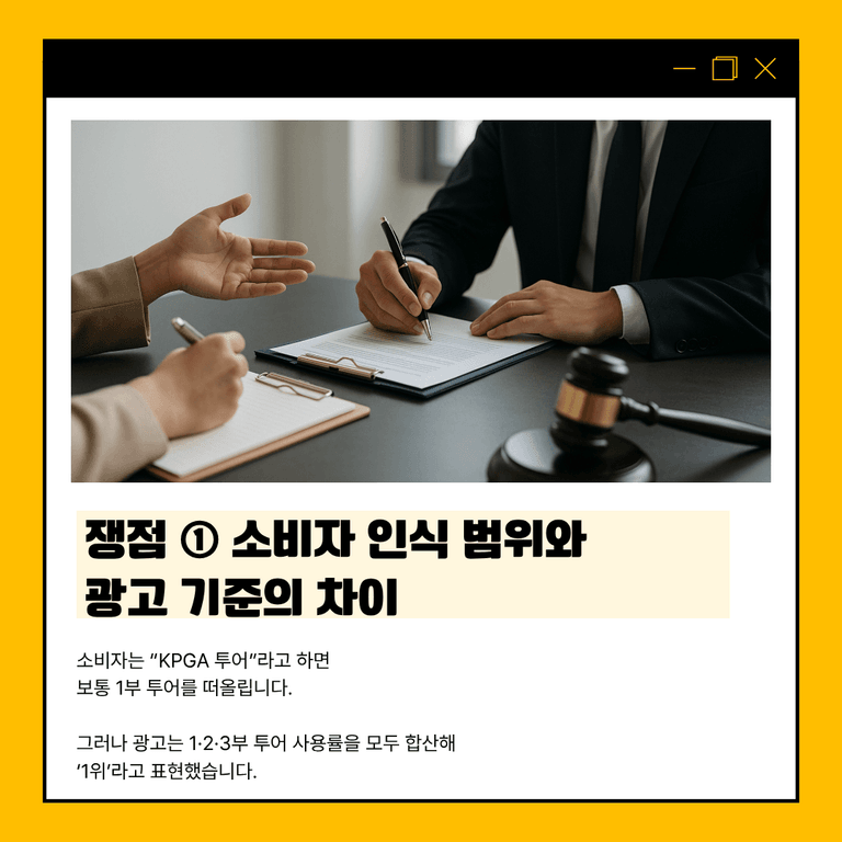 실제 1부 투어 기준 사용률 1위는 다른 경쟁사 제품으로 나타났음에도, 광고 문구만으로는 전체 KPGA 대표 투어에서 1위를 차지한 것처럼 인식될 여지가 있었습니다.