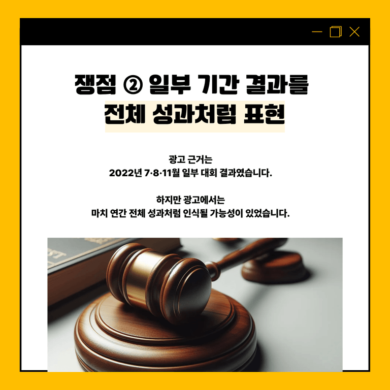 해당 광고는 2022년 7월, 8월, 11월의 일부 대회 결과를 근거로 제작된 것으로 확인되었습니다. 그러나 광고에서는 이러한 기간이 한정적이라는 점이 충분히 명확하게 표시되지 않았습니다.