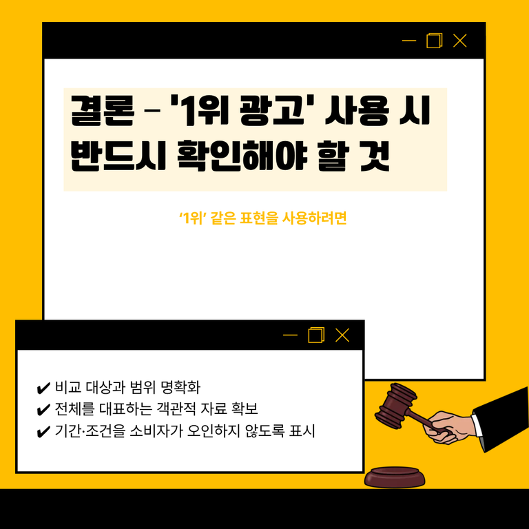 이번 사례는 ‘1위’, ‘최고’, ‘유일’과 같은 배타적 표현이 단순한 마케팅 문구에 그치지 않으며, 법적 책임이 문제 될 수 있음을 보여줍니다.