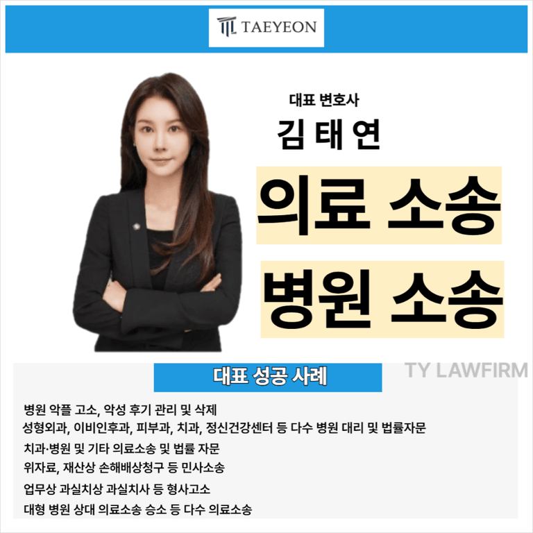 태연법률사무소의 김태연 대표 변호사 님께서는 의료 소송 특화 변호사로, 의료 사고 업무상 과실치사상 고소 사건, 의료 사고 손해배상 및 정신적 피해 보상 사건 등 각종 의료 분쟁을 성공적으로 해결하고 계십니다.