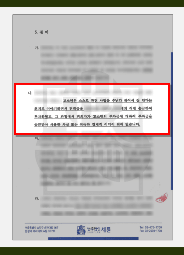 C 씨 역시 투자 당시 사업 실패 가능성을 인지하고 있었으며, 그럼에도 본인의 판단으로 투자를 결정했다는 사실이 메시지 기록을 통해 확인되었습니다.