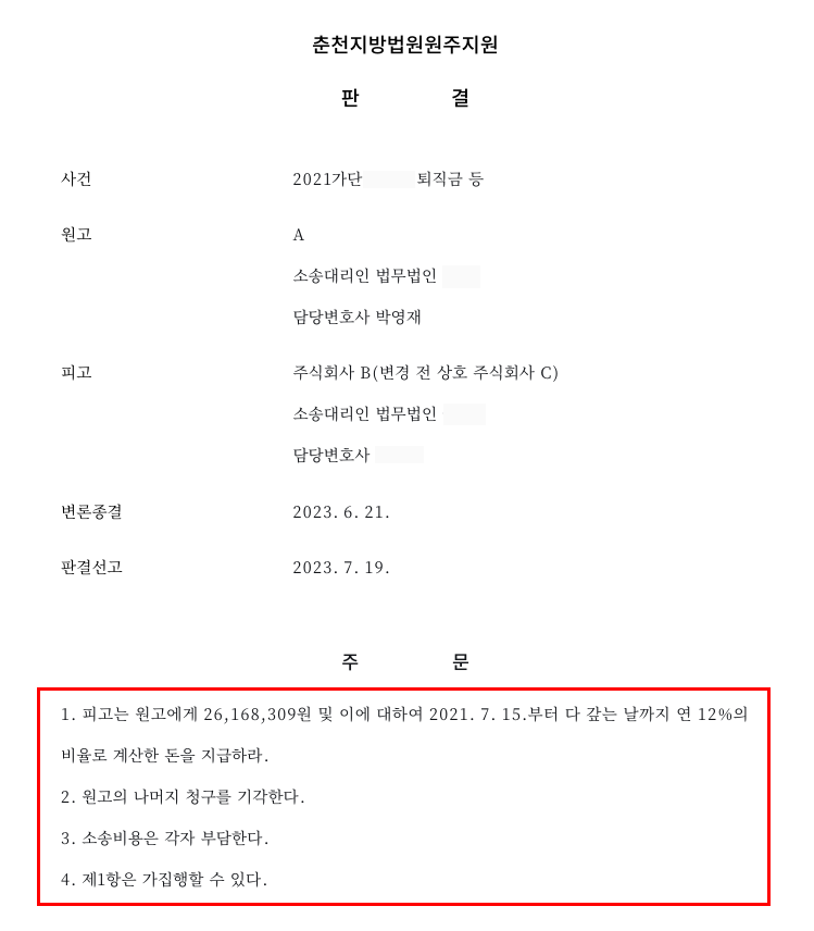 ⑤판결 : 법원은 의뢰인이 형식상 지입계약을 체결했더라도 실질적으로는 회사의 지휘·감독 아래 종속적으로 근로를 제공한 근로자에 해당한다고 판단했습니다. 이에 따라 회사는 의뢰인에게 퇴직금 26,168,309원과 지연손해금을 지급할 의무가 있다고 판결하여 의뢰인의 청구를 상당 부분 인용했습니다.