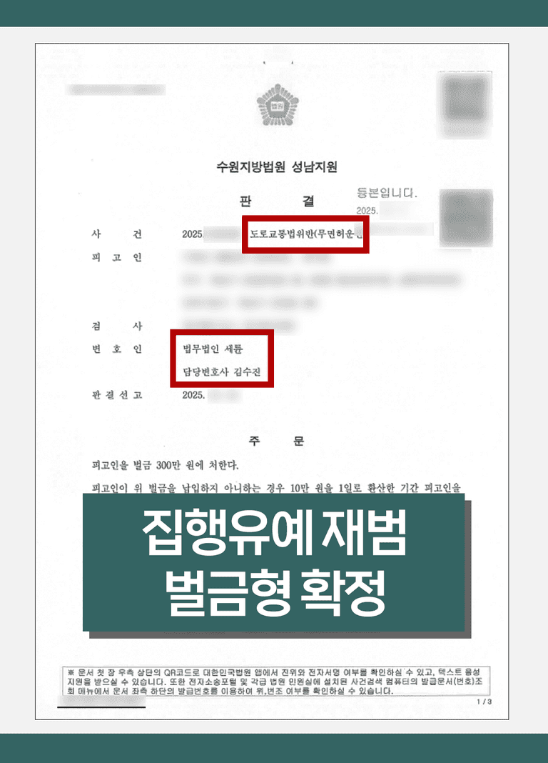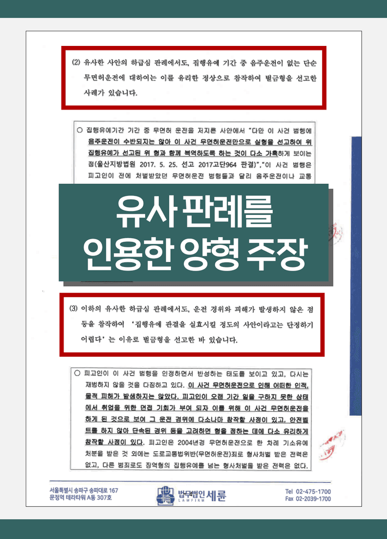 또한 유사한 무면허운전 사건 중 사고가 발생하지 않은 경우 벌금형이 선고된 하급심 판례들을 근거로 양형 의견을 정리했습니다. 아울러 ▲ 사건 이후 차량을 처분하고 대중교통을 이용하고 있는 점, ▲ 집행유예 판결 이후 별다른 문제 없이 생활해 왔다는 점 등도 함께 설명했습니다.