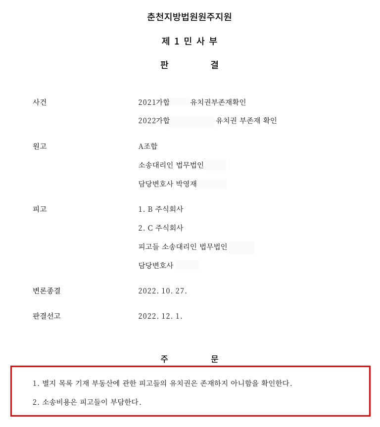 ⑤판결 : 법원은 공사 도급업체가 이미 유치권 포기 각서를 작성한 이상 유치권을 주장할 수 없다고 판단했고, 하도급업체에 대해서도 독립적인 점유 사실이 인정되지 않는다고 보았습니다. 결국 해당 부동산에 관한 피고들의 유치권은 존재하지 않는다는 점이 확인되었고, 의뢰인의 청구가 전부 인용되는 판결이 선고되었습니다.