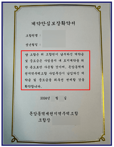 해당 문서에는 “사업이 무산되면 계약금과 중도금을 우선적으로 반환하겠다”는 내용이 담겨 있습니다. 그러나 지역주택조합 사업은 조합원들의 분담금을 통해 아파트를 건설하는 구조이므로, 조합 자산을 매각하여 환불하겠다는 내용은 사전에 총회 결의를 통해 발급되어야 합니다.