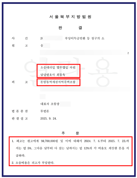 결국 서울북부지방법원은 돈암동역세권 지역주택조합이 의뢰인에게 납입금 9,870만 원 전액과 지연이자를 반환해야 한다고 판결하였습니다.