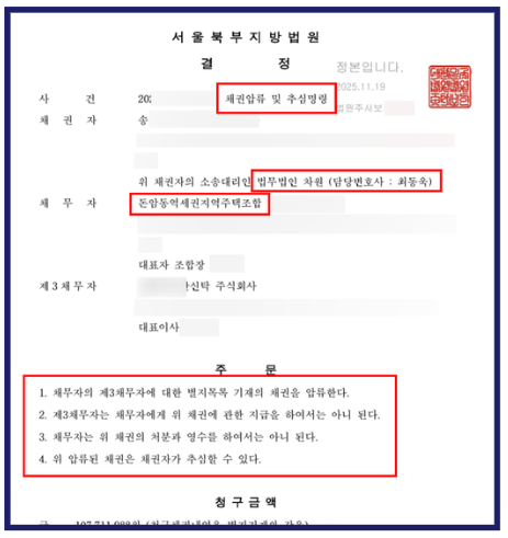 이런 절차는 높은 전문성과 책임을 요구하는 과정입니다. 그래서 지주택 소송을 맡길 변호사를 선택할 때는 승소 경험뿐만 아니라 자산 추적, 강제집행, 추심금 청구 소송 등 다양한 절차를 통해 실제로 판결금을 회수한 경험도 확인하시기를 권해드립니다.