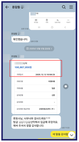 최동욱 변호사는 판결 이후 즉시 강제집행 절차를 진행하였고, 그 결과 의뢰인은 2025년 12월 12일에 납입금 9,870만 원과 지연이자 730만 원을 포함하여 총 1억 600만 원을 회수하게 되었습니다. 이렇게 분쟁은 실질적인 금원 반환으로 마무리되었습니다.