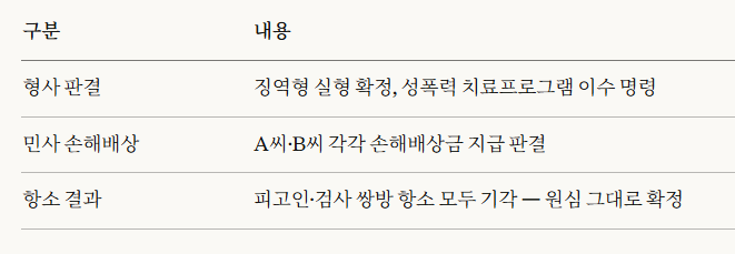 ③ 형사와 민사 동시 진행 — 형사처벌만으로는 피해 회복이 불완전합니다. 민사 손해배상 청구를 병행하여 A씨와 B씨 모두 실질적인 금전 보상까지 받을 수 있도록 했습니다.