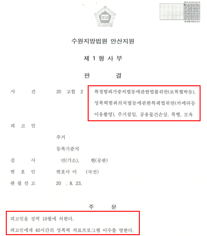 ✔ 재판부 판단 법원은 피고인의 항소를 기각했습니다. 피해자들의 주거지에 수차례 침입하고, 보복 목적으로 협박하며, 수치심을 유발하는 사진을 무단 촬영·전시하고, 공개 채팅방에서 모욕하고, 폭행에 공용물건 손상까지 — 죄질이 불량하다고 판시했습니다. 반성하는 태도 등 유리한 사정도 고려했으나, 전체적인 범행의 경위와 결과를 볼 때 원심 형이 적절하다고 판단했습니다.