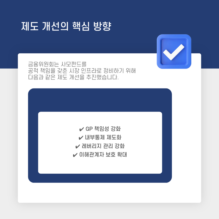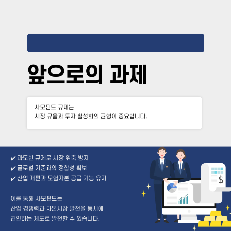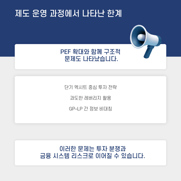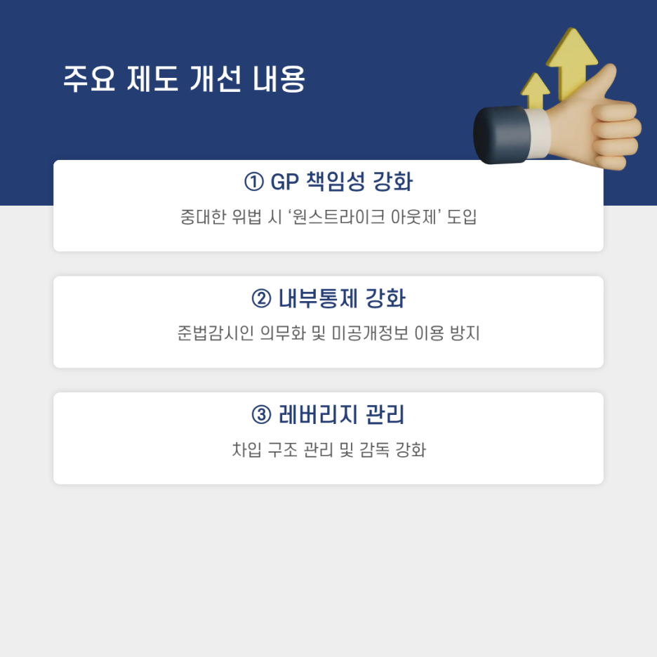 그러나 단기 엑시트 전략, 과도한 레버리지, GP – LP 간 정보 비대칭과 내부통제 미흡 문제는 제도 설계의 적정성에 대한 근본적 재검토를 요구하고 있습니다. 최근 금융위원회에서 발표된 제도 개선안은 PEF를 공적 책임을 강화한 시장 인프라로 기능하도록 제도를 정비하려는 취지로 이해됩니다.