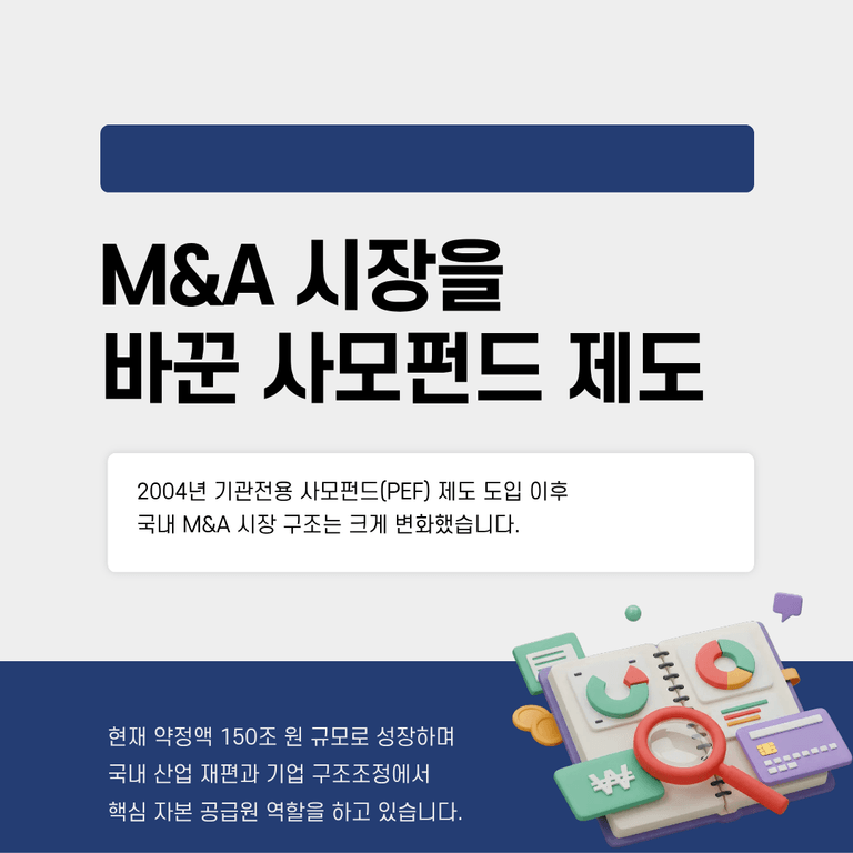 2004년 기관전용 사모펀드(PEF) 제도가 도입된 이후 국내 M&A 시장의 구조는 근본적으로 변화하였습니다. 외환위기 이후 국내 자본의 육성과 구조조정 지원을 목표로 출발한 PEF는 현재 약정액 150조 원을 넘는 국내 M&A 시장에서 중요한 자본 공급원으로 기능하며 산업 재편, 지배구조 변화, 고용 및 금융 안정에도 일정한 영향을 미치고 있습니다.