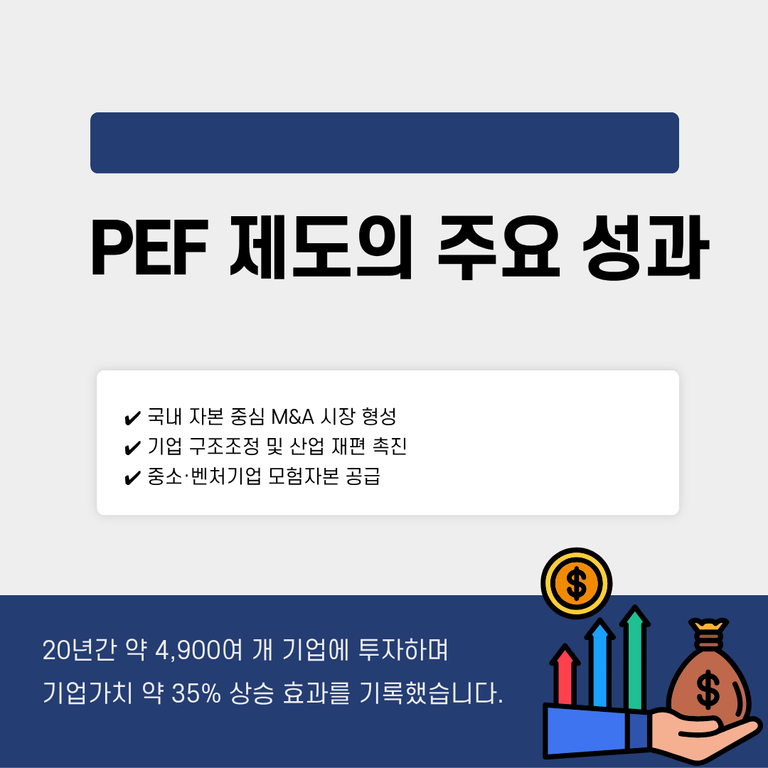 2004년 제도 도입 이후 PEF는 외환위기 이후 외국계 자본에 의존하던 M&A 시장에서 국내 자본의 역할을 실질적으로 확대하였습니다. 특히 구조조정 국면에서 유동성 공급자로 기능하며 산업 재편을 촉진하였다는 점은 제도 도입의 정책 목적에 부합하는 성과입니다.