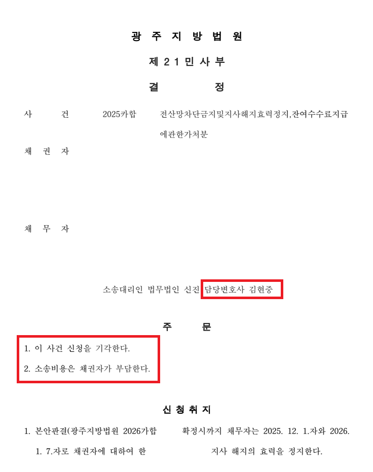 법원은 우리의 주장을 모두 받아주어 가처분 신청을 기각하였습니다.