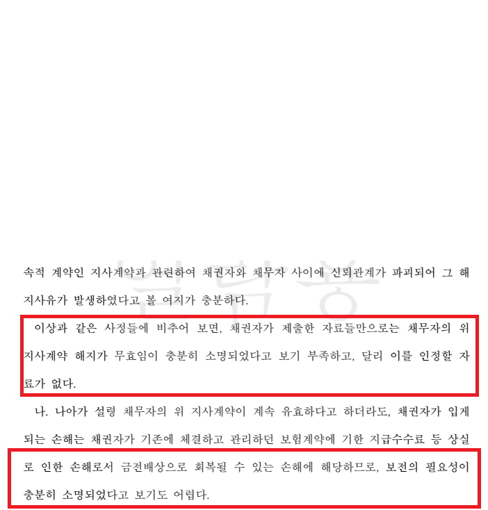 이를 기초로 1) 계약상 계약해지 사유가 분명히 있음을 설명한 뒤, 2) 그 외에도 관련 법령(보험업법)상 지사는 유지될 수 없으며 3) 당사자 사이의 신뢰가 파괴되어 계약을 유지할 수 없다는 점을 법원에 설명하였습니다.