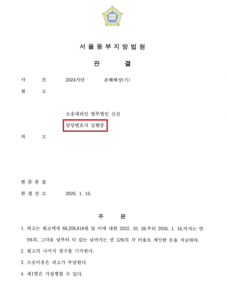 법원은 우리의 주장을 모두 받아들여 주어, 청구금액 전부에 대하여 인용하였습니다.