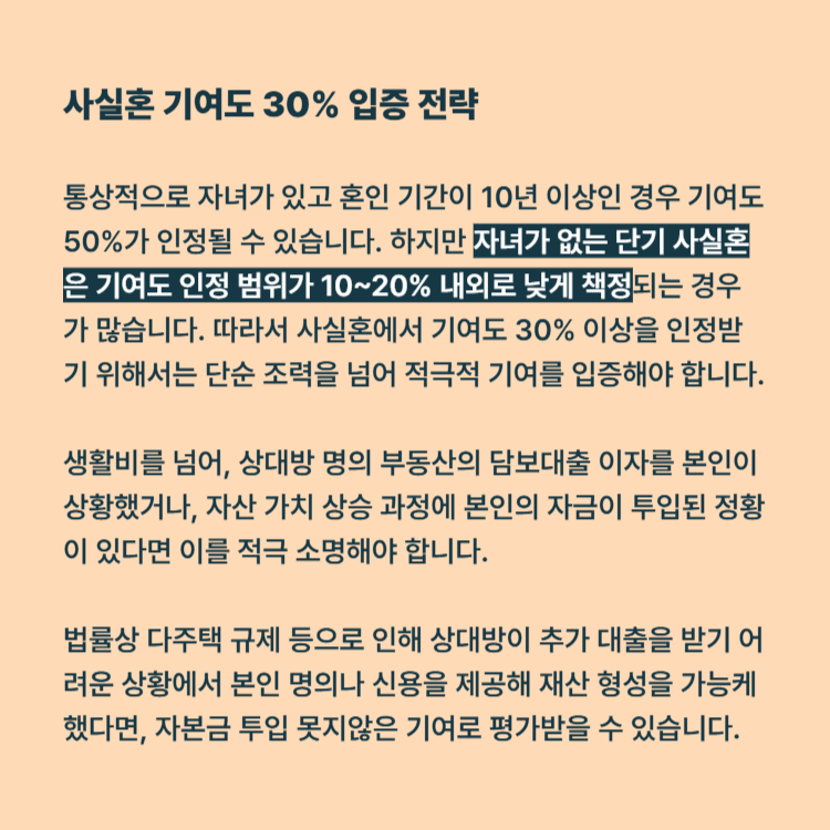 통상적으로 자녀가 있고 혼인 기간이 10년 이상인 경우 기여도는 50%에 수렴하는 경향이 있습니다. 하지만 자녀가 없는 단기 사실혼은 기여도 인정 범위가 10~20% 내외로 낮게 책정되는 경우가 허다합니다. 따라서 사실혼에서 30% 이상의 높은 기여도를 확보하기 위해서는 단순한 조력을 넘어선 적극적 기여를 입증해야 합니다.