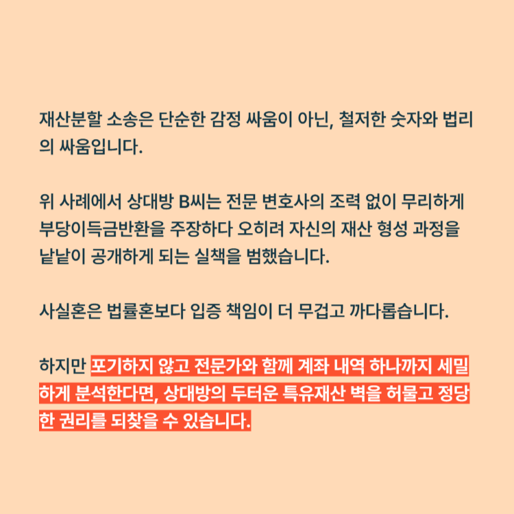 재산분할 소송은 단순한 감정 싸움이 아닌, 철저한 숫자와 법리의 싸움입니다. 위 사례에서 상대방 B씨는 전문 변호사의 조력 없이 무리하게 부당이득금반환을 주장하다 오히려 자신의 재산 형성 과정을 낱낱이 공개하게 되는 실책을 범했습니다.