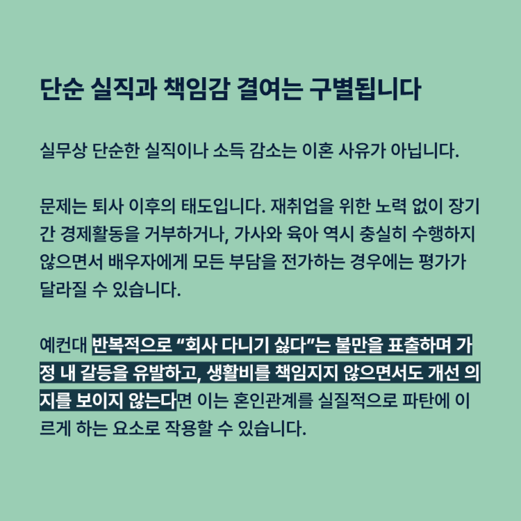 실무상 가장 많이 혼동되는 부분은 퇴사 자체를 유책사유로 보는 인식입니다. 단순한 실직이나 소득 감소는 이혼 사유가 아닙니다.