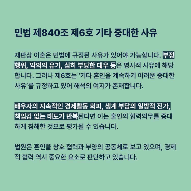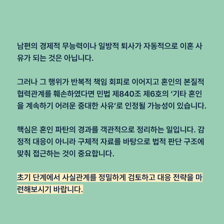 남편의 경제적 무능력이나 일방적 퇴사가 자동적으로 이혼 사유가 되는 것은 아닙니다. 그러나 그 행위가 반복적 책임 회피로 이어지고 혼인의 본질적 협력관계를 훼손하였다면 민법 제840조 제6호의 ‘기타 혼인을 계속하기 어려운 중대한 사유’로 인정될 가능성이 있습니다.