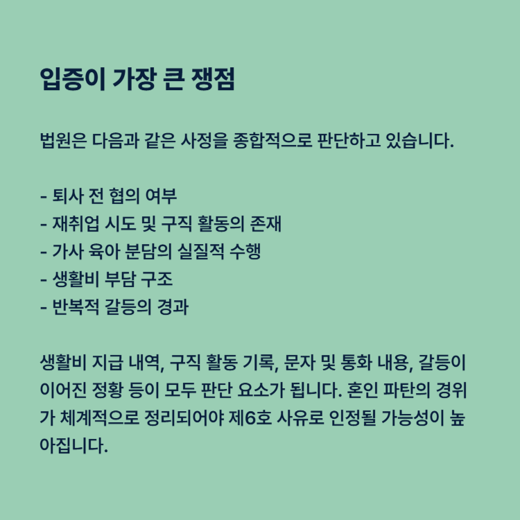 생활비 지급 내역, 구직 활동 기록, 문자 및 통화 내용, 갈등이 이어진 정황 등이 모두 판단 요소가 됩니다. 혼인 파탄의 경위가 체계적으로 정리되어야 제6호 사유로 인정될 가능성이 높아집니다.
