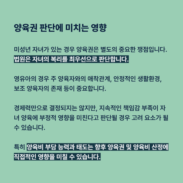 특히 양육비 부담 능력과 태도는 향후 양육권 및 양육비 산정에 직접적인 영향을 미칠 수 있습니다.