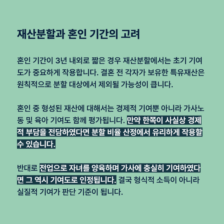 혼인 기간이 3년 내외로 짧은 경우 재산분할에서는 초기 기여도가 중요하게 작용합니다. 결혼 전 각자가 보유한 특유재산은 원칙적으로 분할 대상에서 제외될 가능성이 큽니다.