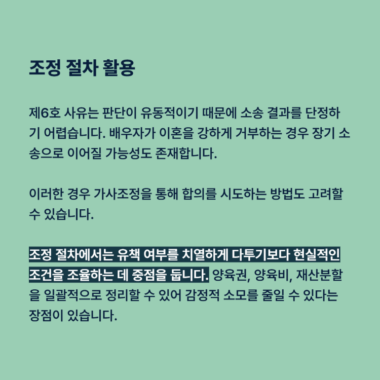 제6호 사유는 판단이 유동적이기 때문에 소송 결과를 단정하기 어렵습니다. 배우자가 이혼을 강하게 거부하는 경우 장기 소송으로 이어질 가능성도 존재합니다.