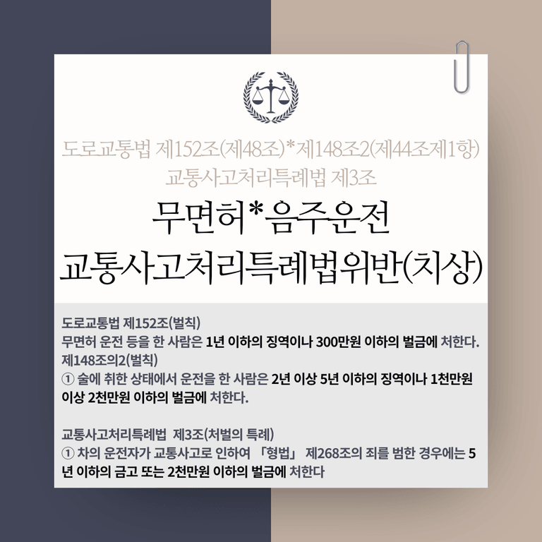 그에 따라 의뢰인은 도로교통법 위반(무면허운전 등의 금지, 술에 취한 상태에서의 운전 금지) 교통사고처리특례법 위반(치상) 혐의로 피소됐습니다.