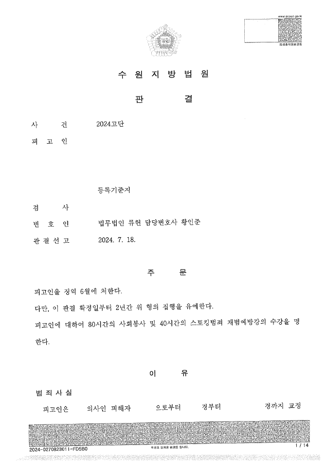 이 사건은 피해자와의 합의가 이루어지지 않은 상황이었고 스토킹 범죄로 기소된 사건이었기 때문에 실형 선고 가능성도 존재하는 상황이었습니다. 그러나 변호인은 의뢰인이 자신의 잘못을 인정하고 진지하게 반성하고 있다는 점과 사건 당시의 정신적 상황, 가족의 보호와 관리 의지 등을 충실히 설명하여 재판부가 이를 고려할 수 있도록 하였습니다.
