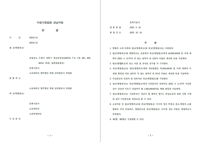 그 결과 의뢰인은 위자료를 부담하게 되었음에도 불구하고, 최종적으로는 위자료 금액을 상회하는 약 7,000만 원의 재산분할금을 상대방으로부터 지급받는 판결을 받을 수 있었습니다.