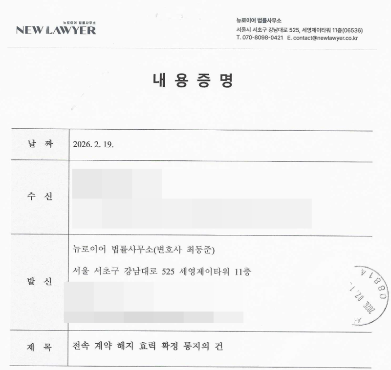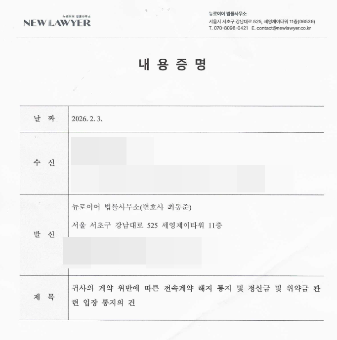 저희는 확보된 증거와 법리를 바탕으로 회사의 귀책사유를 명확히 정리한 스트리머 전속계약 해지 내용증명을 발송하였는데 1차 발송 이후 회사의 회신이 지연되자 곧바로 2차 내용증명을 통해 계약 해지의 불가피성과 향후 법적 절차로 이어질 경우 발생할 수 있는 손해배상 책임에 대해 명확한 법률적 의견을 전달하였습니다