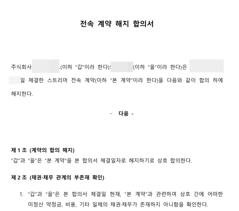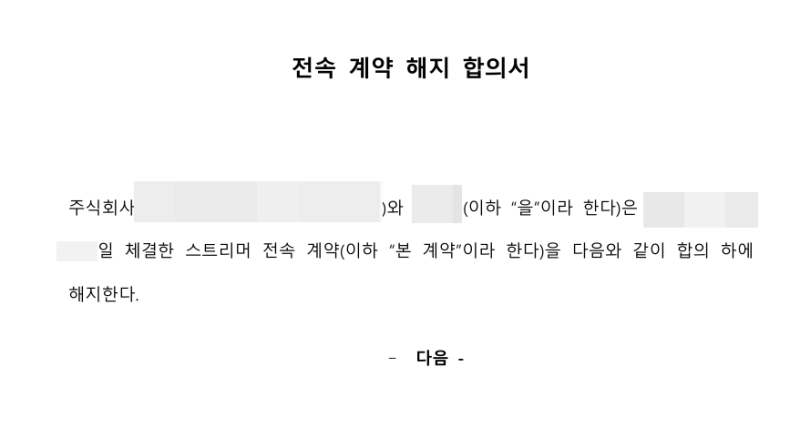 버츄얼 스트리머(라이버) 버튜버 전속계약해지 합의서