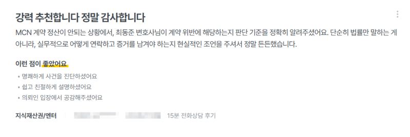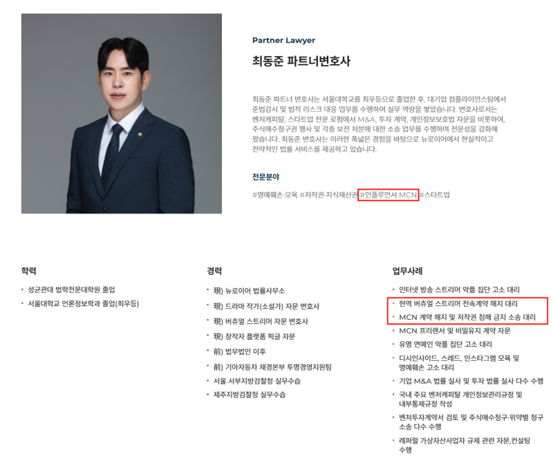 저희는 방송 플랫폼에 대한 이해도가 높고 다수 MCN 계약 자문을 드린 바 있는 변호사를 주축으로 법률 상담을 드리고 있는데요.