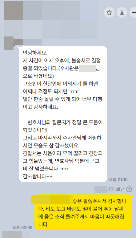 모든 사건이 무사히 종결된 후 의뢰인분께서는 저희 카카오톡 채널 채팅을 통해 그동안 경찰 조사 압박감 때문에 하루하루가 지옥 같았는데 변호사님들 덕분에 전과자 꼬리표를 피하고 무사히 일상으로 돌아가게 되었다며 진심 어린 감사 인사를 전해주셨고, 저희 역시 아무리 불리해 보이는 어려운 케이스라 할지라도 모욕죄 고소 경찰조사 대비를 철저히 하고 절대 포기해서는 안 된다는 사실을 다시금 입증할 수 있어 깊은 안도감을 느꼈습니다.