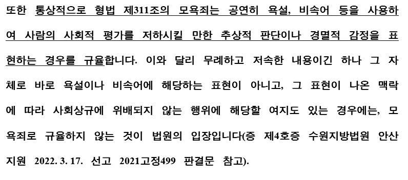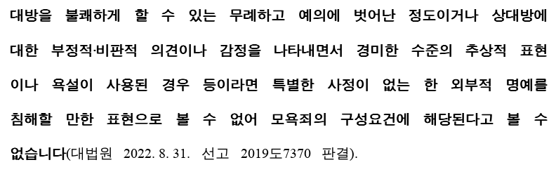 어떠한 표현이 개인의 인격권을 심각하게 침해할 우려가 있는 것이거나 상대방의 인격을 허물어뜨릴 정도로 모멸감을 주는 혐오스러운 욕설이 아니라 상대방을 불쾌하게 할 수 있는 무례하고 예의에 벗어난 정도이거나 상대방에 대한 부정적·비판적 의견이나 감정을 나타내면서 경미한 수준의 추상적 표현이나 욕설이 사용된 경우 등이라면 특별한 사정이 없는 한 외부적 명예를 침해할 만한 표현으로 볼 수 없어 모욕죄의 구성요건에 해당된다고 볼 수 없다라고 판시하였습니다.