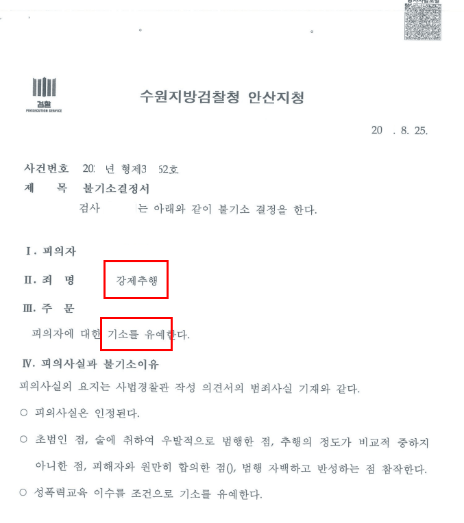 즉, 정식 재판 없이 형사처벌을 하지 않는 선에서 사건이 마무리된 것입니다.