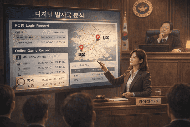 ③ 디지털 발자국 추적 — 그리고 결정적인 발견 CCTV 속 범행 장소는 경북 지역이었습니다. 최이선 변호사는 의뢰인의 네이버·구글·SNS 접속 기록, 인터넷 접속 로그, 온라인 게임 계정 기록을 집요하게 분석했습니다.