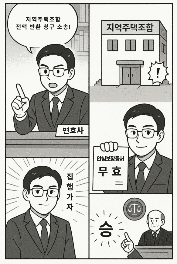 법리 적용: 민간임대아파트는 지역주택조합과 적용되는 법령은 다소 차이가 있으나, 증서 무효에 따른 계약 무효 및 전액 반환이라는 논리는 동일하게 적용됩니다.