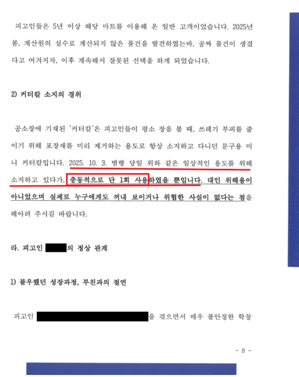이런 상태에서 두 사람은 2025년 8월에서 10월 사이 집 근처 이마트에서 무려 6회에 걸쳐 85만 원 상당의 물건을 절취하였습니다. 특히나 두 사람은 커터칼을 들고가서, 남편이 박스에 있는 끈을 끊으면, 아내가 가방에 담는 식으로 절취하였는데 이는 매우 죄질이 좋지 않게 평가됩니다.